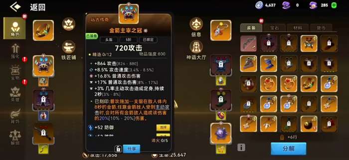 猎手玉扳指为他带来9%左右的普攻伤害提升之后,还有一定的生命加成,1000多点的生命加成,会让他后期在刻印之后,普攻获得20%的攻击速度加成,攻击速度对于攻击流来说也是非常重要的,而金箭主宰之冠其实是很多玩家玩弓箭流比较固定的一个搭配,它作为传奇品质的装备,经常会跟弓箭流的速射一起出现,它的能力都是会为弓箭流带来足够的速度加成,而且有一个造成定身的能力,会让敌人持续两秒站在原地,所以这样的效果放在弓箭流里面使用起来的话,非常适合搭配蓄力输出,最后的魔力护腿带来的也是生命数值以及速度加成的效果。