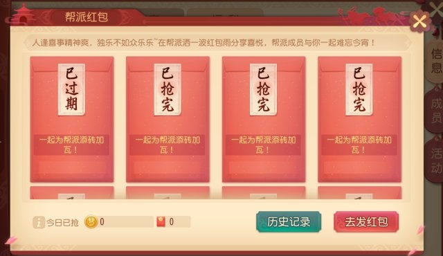 帮派成员可在帮派中发放金币红包,当放入红包的总金币数量超过100000时,会在帮派内落下红包雨。每周发放的红包数量不可超过少侠通过其他途径消费的充值仙玉数量。红包发放的时间为10分钟,超时后,未被领取的金额将会原路返还。