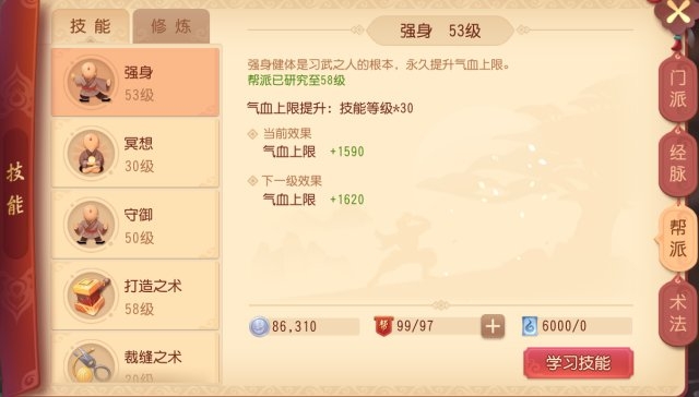 技能包括强身、冥想、守御等,诸位可按需进行学习。