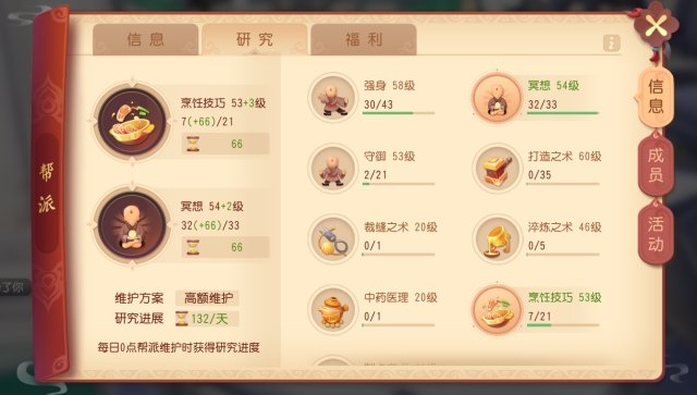每日0点帮派维护是帮派研究生效节点,进度增加与维护方案以及书院等级相关。