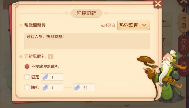 帮派成员可对新入帮的成员发放迎新见面礼,也可消耗少量银币,将银叶子放入迎新礼包中。注意,迎新见面礼每14天只可领取一次。