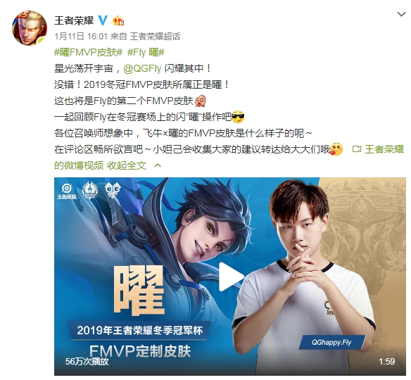 星光荡开宇宙,Fly闪耀其中。没有悬念,2019冬冠FMVP皮肤归属正是曜。昨日,王者荣耀官博官宣了这一消息,这也是Fly的第二个FMVP皮肤。