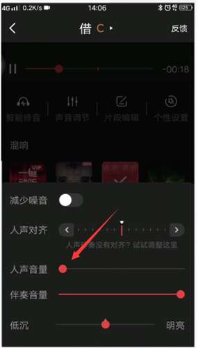 进入录制页面,完成录制后,点击右下角【结束】,在歌曲录制设置窗口,切换到【声音】界面,在声音窗口,将【人声音量】调到最低,【伴奏音量】调到最高,调好之后点击【保存】,