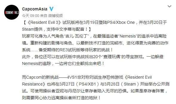 近日《生化危机3:重制版》试玩版即将在3月19日登陆PS4/S4/Xbox One,3月20日登陆Steam。本次试玩版支持中文字幕/配音,且试玩版没有时间、次数限制。各位感兴趣的玩家千万不要错过这免费玩“新作”的机会啊!