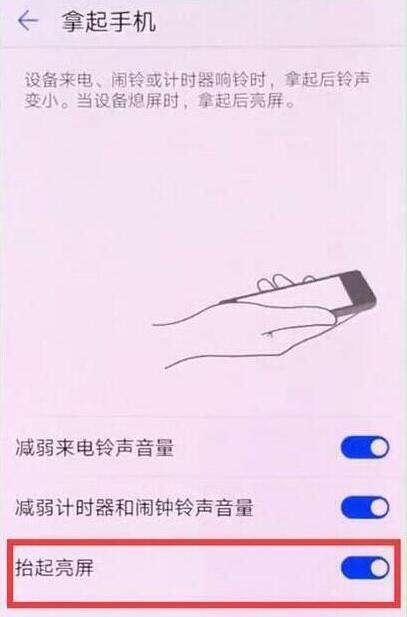 最后我们点击打开【抬起亮屏】的开关即可打开这个功能,在手机黑屏的时候拿起手机即可亮屏。