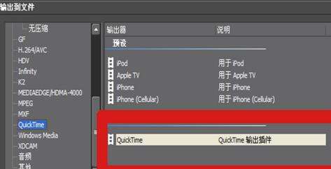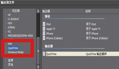 在右侧选择【QuickTime输出插件】选项,点击输出按钮。