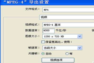 打开mp4导出对话框,设置文件格式为mp4,数据速率为4000,图像大小为1280*720hd,帧速率为当前大小,关键帧为自动,点击确定。