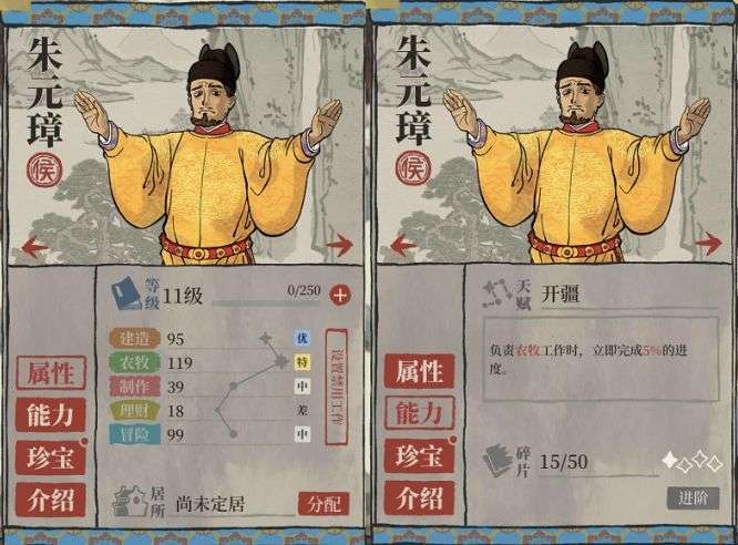 朱元璋的天赋是“开疆”。朱元璋在负责农牧工作时,会立即完成5%的进度,农牧值也为特级。