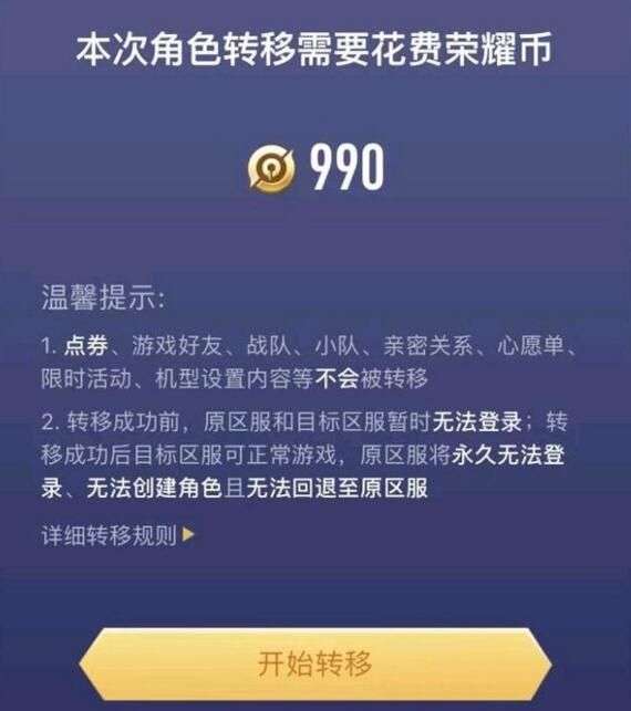 第三步、可以看到本次转移价格,转区需要990荣耀币,也就是转一次要99元,这个不管是安卓转苹果还是苹果转安卓价格都是一样的。