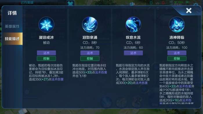 甄姬这个英雄的被动技能每次的技能伤害都会为目标叠加一个持续7秒的冰冻印记,这个印记叠满3层之后就会冰冻目标,也就是说甄姬这个英雄想冻住人就需要一个目标在7秒内受到甄姬3次的技能伤害,一技能是一个范围内击飞技能,在游戏中更加侧重于使用者的预判能力,这个技能在使用的时候是有一定的提示的,短暂的时间之后才会击飞范围内的目标,二技能使用之后会引导水流在多个敌人之间来回反弹,最多弹射6次,并且每个敌人最多反弹2次,三技能使用之后会向指定的位置释放一波水域,对范围内的敌人造成减速和法术伤害效果,这个技能在释放的时候,如果碰撞到小兵会将其击退,但是碰到英雄,就会立即展开水域。