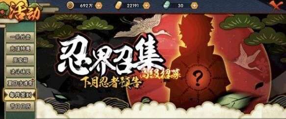 最近很多玩家在问8月签到是什么,这个问题游戏内已经有答案了,只不过有些新玩家会被这个剪影图所误导,误以为是什么新忍者。其实这个就是签到送高招券的意思,而这个剪影图是游戏内通用的一个显示效果,并没有说过具体代表谁,关于这个话题似乎每次预告送高招券的时候都会出现。