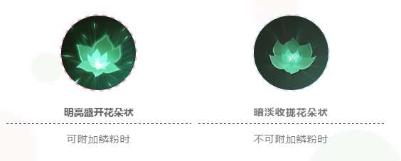 当可以附加鳞粉时,技能图标为明亮盛开的花朵状;不能附加鳞粉时,技能图标为暗淡收拢的花朵状。