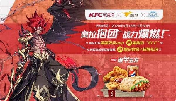 活动内容:在活动期间内,打开【美团外卖】APP(或【美团】APP)搜索附近KFC,购买《奥拉星》手游联动套餐,即可获得专属礼包码1个,该礼包码可在《奥拉星》手游内兑换限定好礼哦!