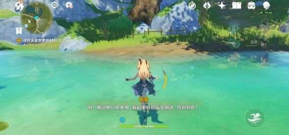 在第一个任务范围里面,用元素视野会看到元素带指引方向的,过去就能看到一个大史莱姆了,再找找,水史莱姆在池子旁,很大,不难找。