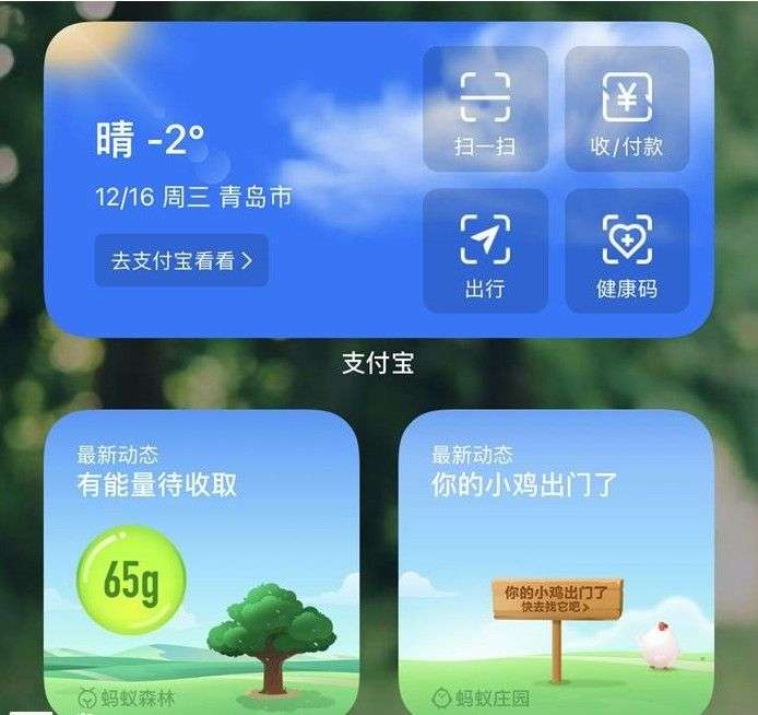 之后就可以在主界面中看到支付宝的小组件,大家可以添加蚂蚁庄园和蚂蚁森林,这样就可以更加方便的看到小鸡的动态和能量球了。