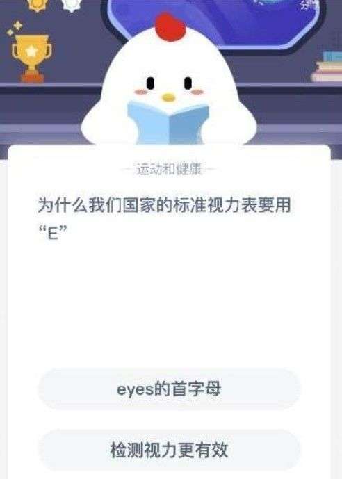 检测视力更有效为什么用E,相信很多玩家都在询问今日题目答案,那么详细的答案如何选择呢,下面为大家介绍蚂蚁庄园检测视力E答案。