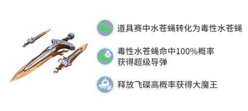 在道具赛中,长青剑能将水苍蝇转化为毒性水苍蝇,对手被毒性水苍蝇禁锢之后,会在短时间内被锁定,无法使用道具,毫无还手之力的敌人只能看着你远去的背影叫苦不迭!