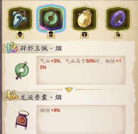 解臾的最佳饰品,目前发现的有盔甲上的绝品的【辟邪玉佩·烟】——不但加5%气血,在血量高于50%的时候物防+15%高额加成。