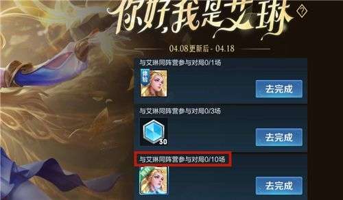 与艾琳参与对局10场,就是匹配赛/排位赛中,有十场是队友选择使用了艾琳。只要拉一个拥有艾琳英雄的召唤师双排,并且保证每一局都玩艾琳,就能在十场打完后完成这个任务。