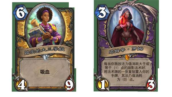 游戏里还有一些小彩蛋,比如塔姆辛·罗姆这个角色,她说她是通灵学园里最优秀的学生,而后来经过设计师的证实,他就是通灵学园版本里踏实的大三学姐,这卡面变化的可真大,据她说她和巫妖王对战过并且活了下来,然后又补充说也不能算活了下来,看来她是被巫妖王复活成亡灵了。