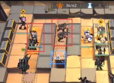 7.用黑角在右路前面拦住一个小兵,拖延哨兵时间。同时上群卫/先锋等待命干员激活右边的萨卡兹组长(上面的组长直接激活,下面的组长等他动了再激活)。