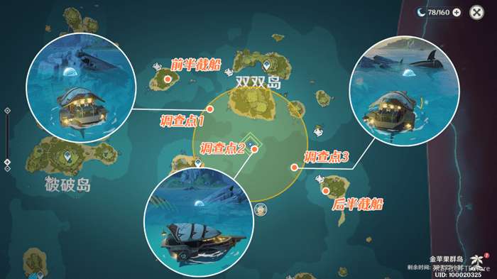 下面直接给出3个调查点在地图上的详细位置,图中黄色调查范围内的3个橘黄色圆圈即为调查点,可以看出基本都处于这两截船所在位置的连线上。靠近水面上的泡泡即可进行调查。