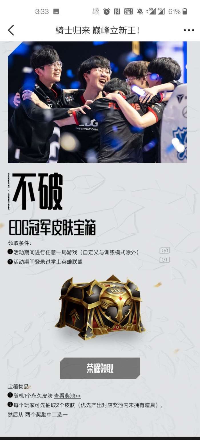 EDG冠军皮肤宝箱领取地址:点击这里