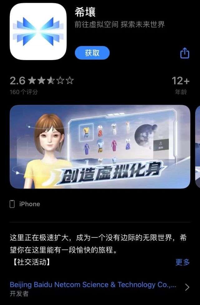 虚拟化身(Avatar)、无限开放的世界、全真人机互动、沉浸式社交,“希壤”中的这都元素也是元宇宙概念中的一部分,因此其也被外界看作是百度试水元宇宙的一个信号。考虑到在今年的百度世界大会上,百度基于“希壤”的虚拟空间多人互动平台打造了VR分会场,所以此次“希壤”APP的源头,应该就是百度在“希壤”虚拟空间多人互动平台基础上推出的独立APP。