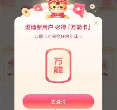 万能卡任务:用户在活动期间通过完成指定任务,或者参与指定活动,可获得万能卡道具。用户使用万能卡可以兑换“压岁钱”“贴春联”“拜新年”“办年货”“年夜饭”中的任意一张。
