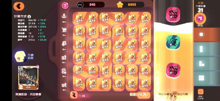然后,辅助,刚入坑推荐白绒绒队长+妖织(因为最容易获得)。优先将主c和妖织升6星。主c方块格开满,全放2-3级的技能强度方糖。