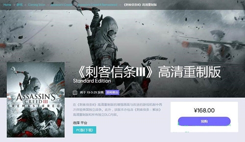 《刺客信条3:重制版》于3月29日也就是今日正式售卖,售价168元,支持中文。这次售卖的《刺客信条3:重制版》提供了增强的画面环境,还包含《刺客信条:解放》高清重制版和所有独立DLC内容。