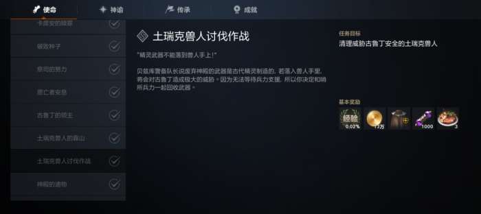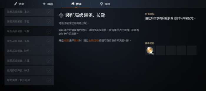 需要注意!随着主线任务的推进,所打怪的难度也会越来越高哦!主线任务给的装备强度也会逐渐不够用,因此我们需要尽可能把支线任务同步推进到【装配高级装备,XX】。该系列的支线任务,会让我们制作六件高级装备(蓝色)~