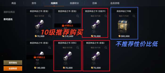 注意!除了主线、掉落和成就给的神谕之书,达到10级后,还可以在商店用7万金币的单价购买至多5个稀有品质的神谕之书,第一天在金币足够的情况下,可以把这5个神谕之书都买了,然后任务全部做完即可~