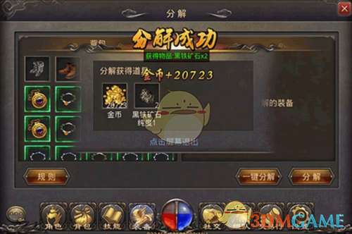 所有装备均可以被分解,装备分解后直接消失。装备分解获得不同纯度的黑铁矿石,等级≥50级的装备分解可额外获得金刚石。