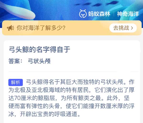 弓头鲸的名字得自于?【神奇海洋】2026年4月10日新题目已开答!正确答案现已公布,点击领取拼图,一起为修复海洋生态贡献力量!今日正确答案是:【弓状头颅】。弓头鲸得名于其巨大而独特的弓状头颅。