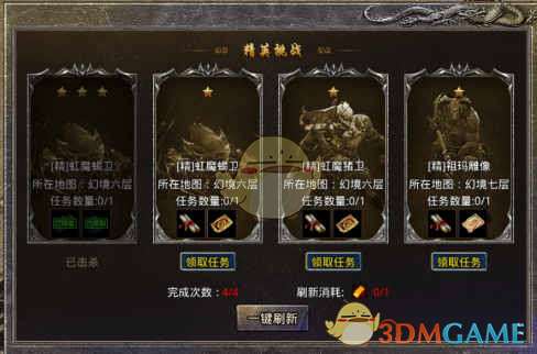 如上图所示,精英挑战每次随机刷新四个不同星级的任务,这里我强烈建议一定要刷俩次三星、俩次俩星任务去做,因为只有俩星和三星任务才能获得以上提到的玉佩试炼和法阵试炼的门票。