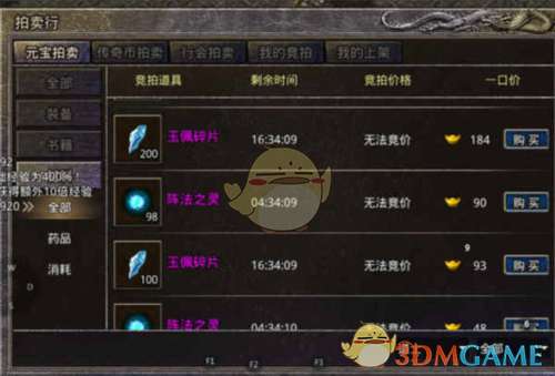 在斩魔无双游戏中拍卖行每天会不定时的刷新上架更重材料其中就会有大量的玉佩碎片和阵法之灵,这是能快速获得这俩个材料的重要途径。