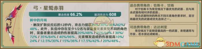 星鹫赤羽为期望最高的武器,相对若水等较适配五星武器提升约有15%~25%,相对精5碎链等低成本四星武器的提升约有35%。