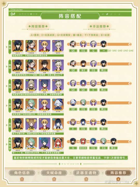 基尼奇本身在战斗中的表现很不错,可以快速积攒挂草。如果想要让其稳定触发烈绽技能,只需要加入一位水属性的后援角色即可。建议选择行秋或夜兰,芙宁娜也可以,但最好再搭配一位全队治疗的角色,这样才能达到最好的效果。