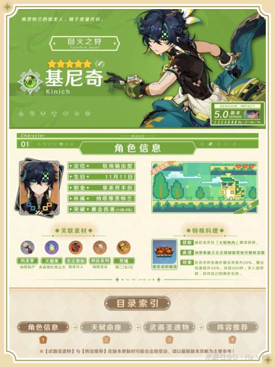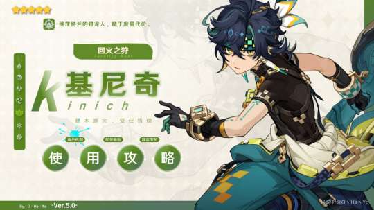 基尼奇是一位5星草系双手剑、以燃烧或烈绽体系为主流的驻场输出型角色,灵活、敏捷的近战型炮手。