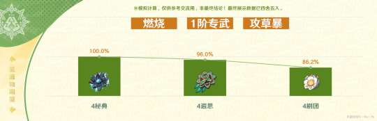 推荐以「黑曜秘典」4件套为目标,其次可考虑「未竟的遐思」4件套(需绑燃烧),过渡可用「黄金剧团」4件套或任意2攻击+2草伤。