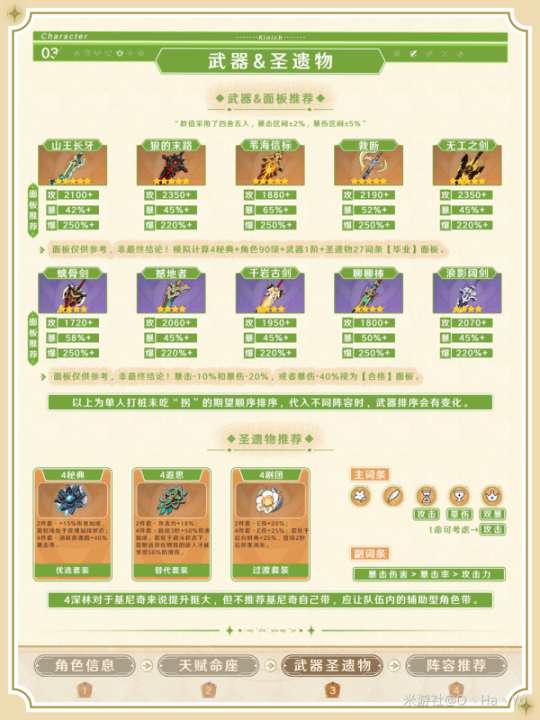 圣遗物的主要属性方面,可以选择绑定攻击沙和草伤杯。之后,根据自身所使用的武器和圣遗物的属性情况,考虑是否选择暴击头或者暴伤头。一般来说,如果使用4件秘典,那么战前的面板应当拥有40%至50%的暴击率,这样就比较完美了。但是如果选择了4件遐思,那么则需要更高的暴击率,大约为60%至70%。另外,如果解锁了1命,可以考虑选择“攻击头”属性。