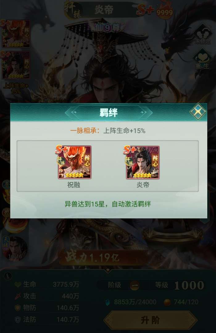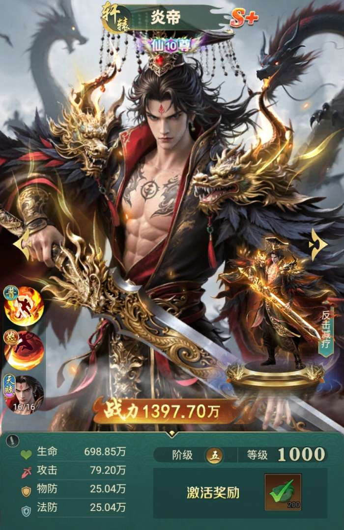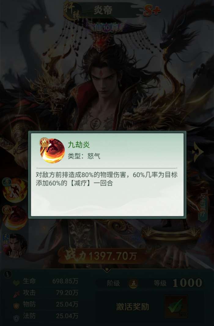 若是炎帝升到较高的星级,那他自身的能力还会得到强化。九星时,炎帝每承受四次普攻伤害便可令自己享受到一次恢复生命值的效果,令他拥有更出色的坦度。若是达到了真仙1重,炎帝不管是受到普攻还是技能所施加的伤害,都有概率对敌方发动一次反击,搭配上炎帝的前排定位,一回合内只要运气不是太差,炎帝能稳定地反击三到四次,虽然说反击打出的伤害会以敌方最大生命值的5%为基准,但在高频率的反击下,可造成的总伤会十分的可观,也令炎帝在达到真仙1重后能作为队中的主C来使用。