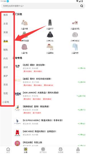 1、进入商城分类页,选择童装类别查看细分专场与商品。