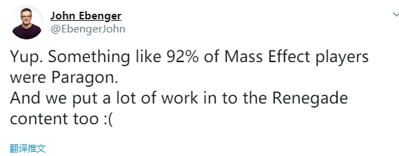 他在推特上表示同意玩家在虚拟世界中也偏向于循规蹈矩的结论,并称“92%的《质量效应》玩家都偏向Paragon(游戏中的善),明明我们在Renegade(恶)的选项后续内容也投入了很大量的工作,难过。”