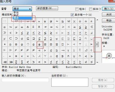 在随后弹出来的“插入符号”对话框中,将“查看”设置为“描述”,直接点击输入框后面的三角下拉菜单中的“描述”就可以了。在下面的符号面板中,拉动滚动条,找到相应的带圈星号,点击插入就行了。