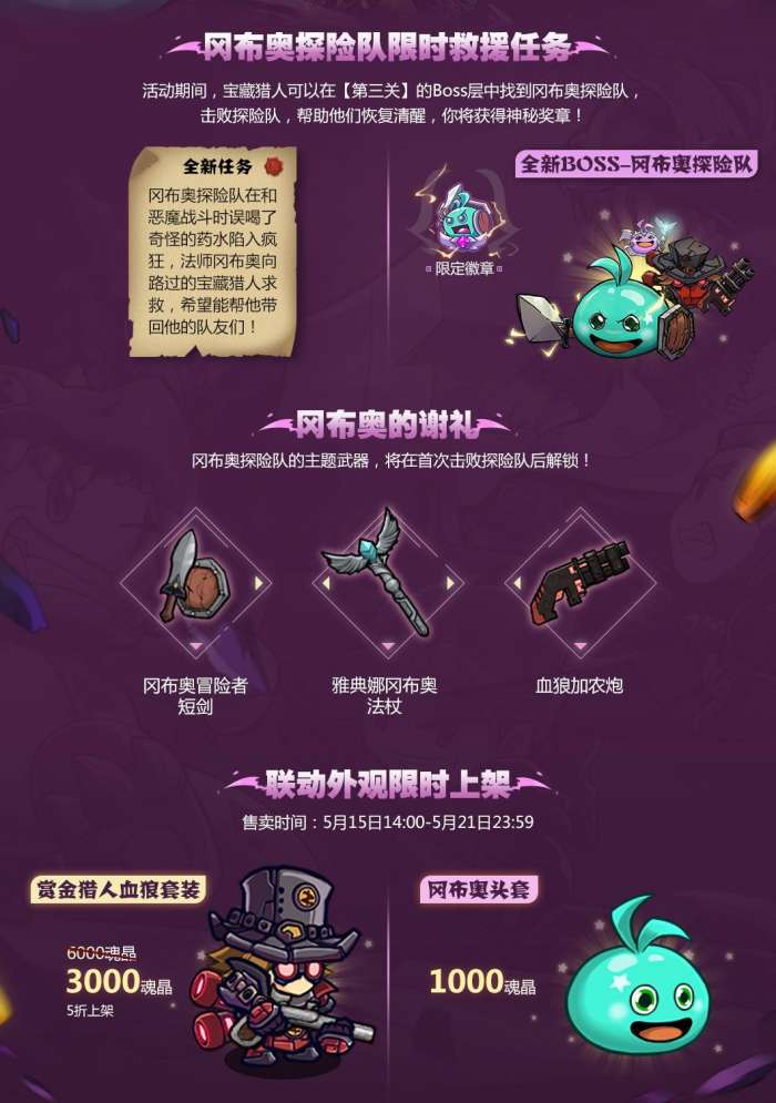 活动期间击败冈布奥探险队,将在城堡随机库中永久解锁该联动主题的武器和神秘奖章。