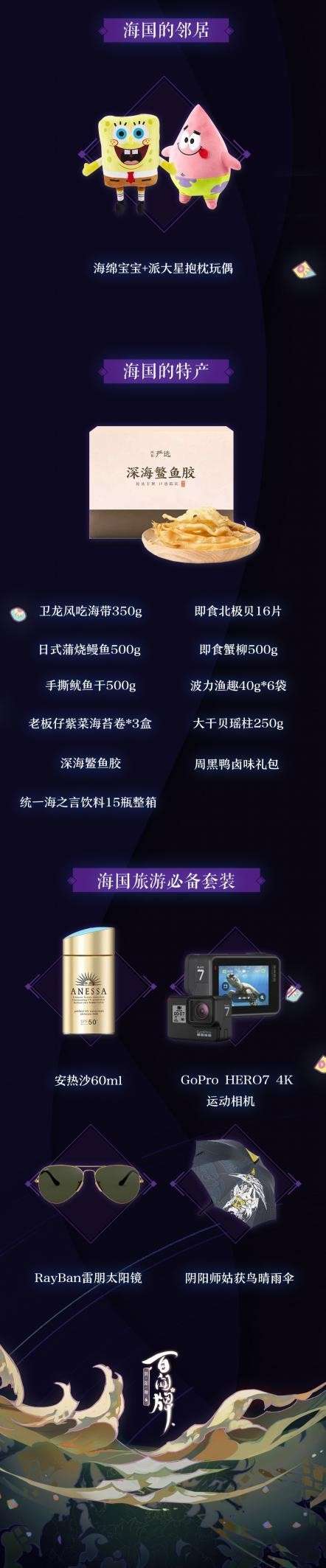 其余三重福利为实体奖,“海国的邻居”内含派大星与海绵宝宝抱枕玩偶一套。“海国的特产则有卫龙风吃海带、即食北极贝、日式蒲烧鳗鱼、即食蟹柳等,满满的海洋食品,让锦鲤一次性饱餐海国珍馐。“海国旅游必备套装”中有安耐晒、GO PRO、雷朋墨镜等,都是海洋旅行必备好物。