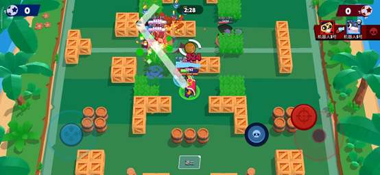如在硬石矿井这张地图中,就有很多适合的角度。游戏开局时,可以选择先走中路打一波输出。如图中,利用墙壁的弹射延长攻击距离,更加容易打到人。