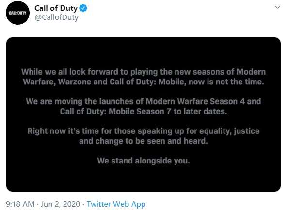 今天(6月2日)《使命召唤》官方 Twitter 宣布,原定于6月3日推出的《使命召唤:现代战争》第四赛季内容将延期,与此同时《使命召唤:移动版》的第七赛季内容也将同步延期,目前官方还尚未公开具体的推出时间。